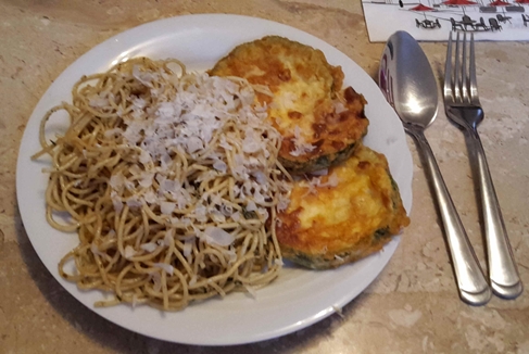 Die noch warmen Zucchini-Taler auf die Teller mit dem Spaghettisalat